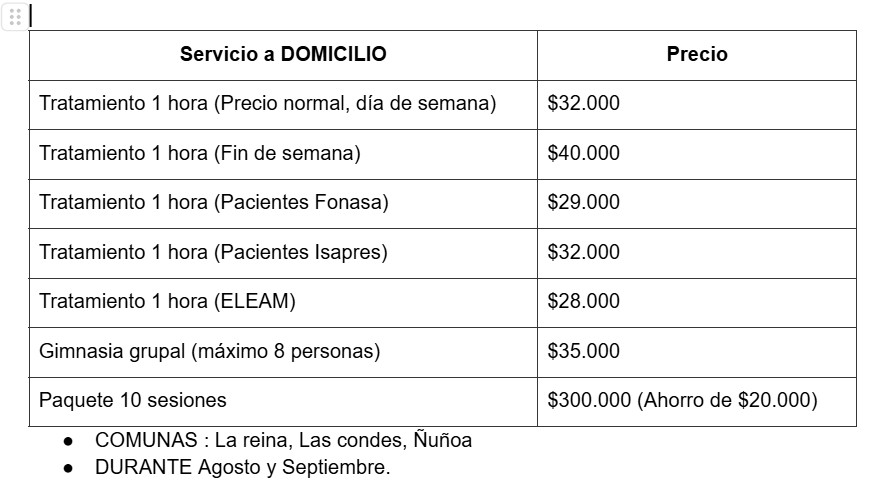 - Servicios: Kinesiterapia respiratoria; rehabilitación motora; Rehabilitación neurológica e intervención en pacientes con demencia; kinesiterapia de mantención de condiciones patológicas motoras crónicas; fisioterapia para personas mayores; reeducación de marcha; rehabilitación operación de cadera; prevención de caídas; Evaluación de seguridad dentro del hogar; Kinesiología respiratoria para personas mayores; Gimnasia para persona mayor; entre otros.